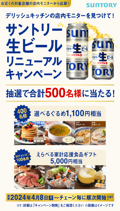 詳しくは以下のご案内、またはDELISH KITCHENの店内モニターで流れるキャンペーンのご案内をご確認ください