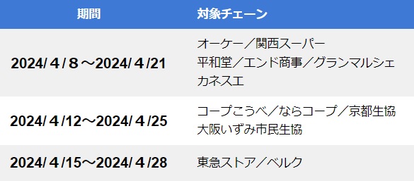| 2024/4/8~2024/4/21 | オーケー/関西スーパー 平和堂/エンド商事/グランマルシェ カネスエ |